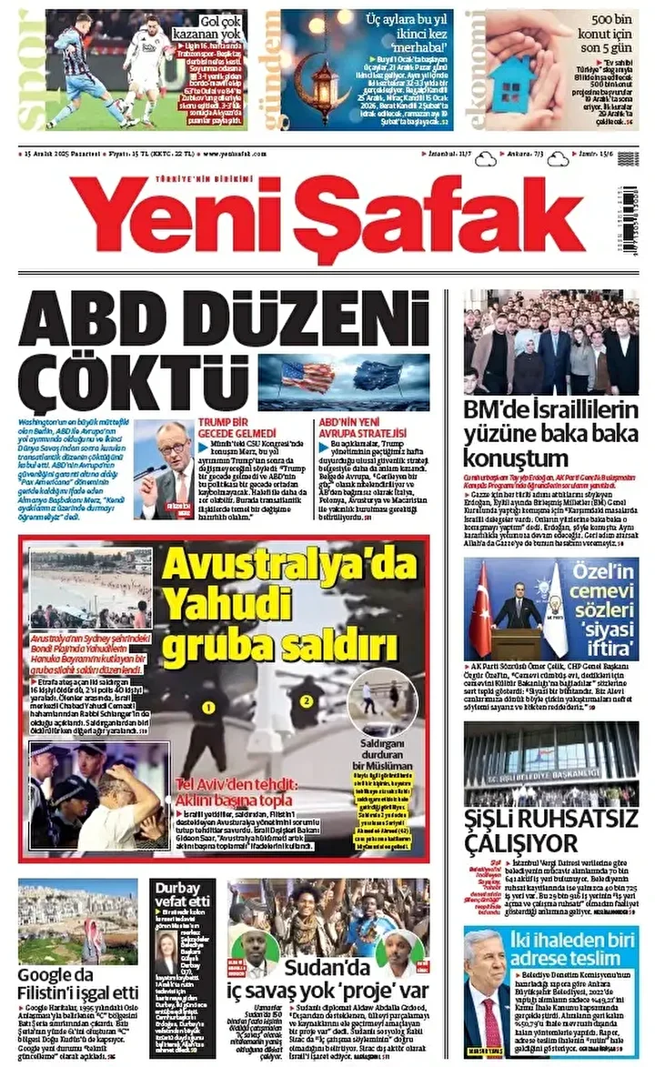 Yeni Şafak Gazetesi’nin 15 Aralık 2025 tarihli birinci sayfasında yer alan manşet ve haberler…
