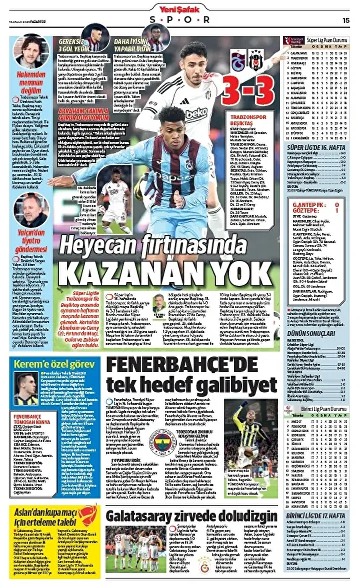 Süper Lig’de Trabzonspor ile Beşiktaş arasında oynanan haftanın maçında kazanan çıkmadı. Kartal’da Abraham ve Cerny (2); Fırtına’da Muçi, Oulai ve Zubkov ağları buldu.