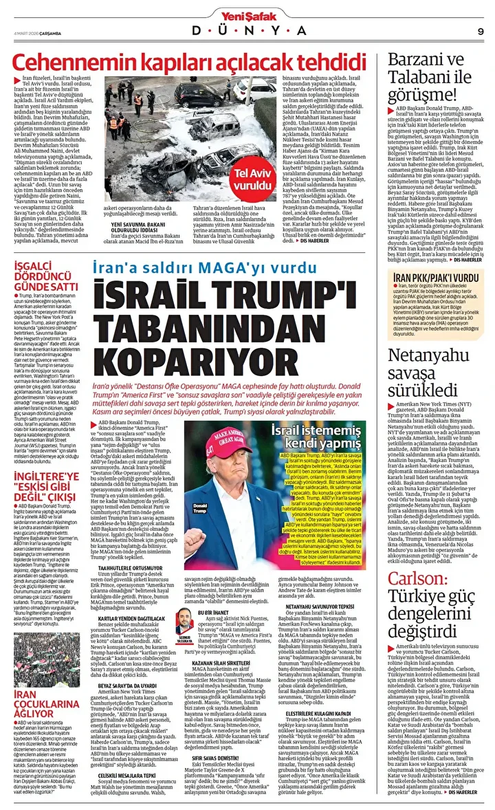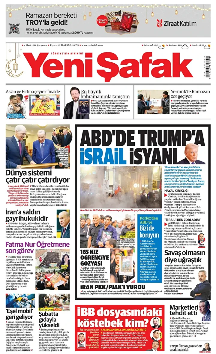 Yeni Şafak Gazetesi’nin 4 Mart 2026 tarihli birinci sayfasında yer alan manşet ve haberler…