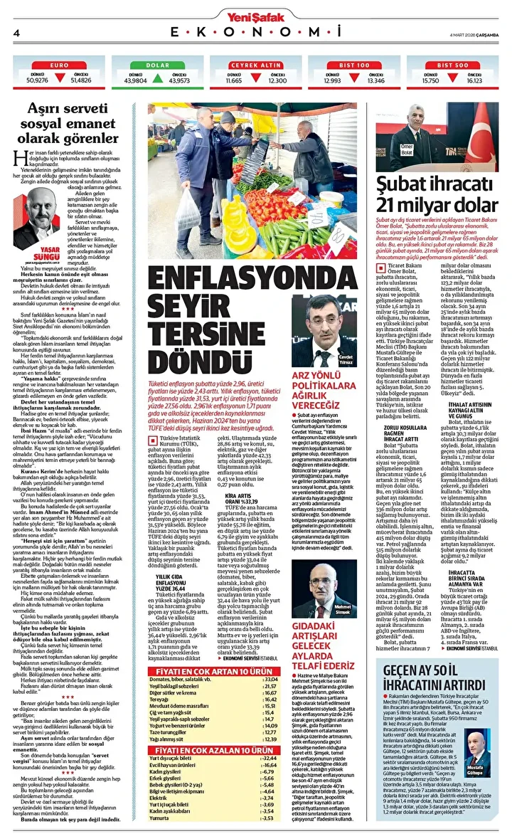 Yeni Şafak Gazetesi’nin 4 Mart 2026 tarihli birinci sayfasında yer alan manşet ve haberler… Enflasyonda seyir tersine döndü Tüketici enflasyon şubatta yüzde 2,96, üretici fiyatları ise yüzde 2,43 arttı. Yıllık enflasyon, tüketici fiyatlarında …
