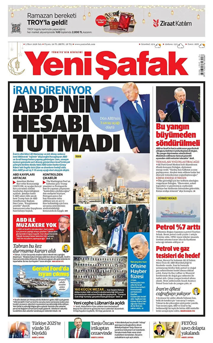 Yeni Şafak Gazetesi’nin 03 Mart 2026 tarihli birinci sayfasında yer alan manşet ve haberler…