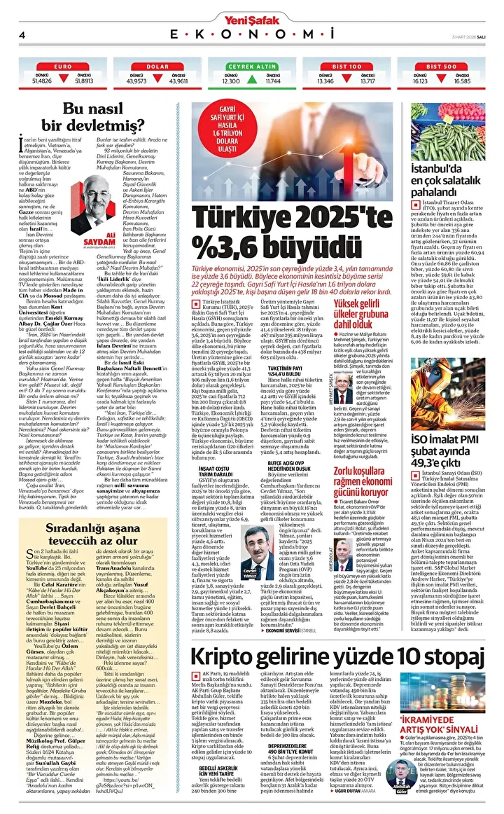 Yeni Şafak Gazetesi’nin 03 Mart 2026 tarihli birinci sayfasında yer alan manşet ve haberler… Türkiye 2025’te yüzde 3,6 büyüdü Türkiye ekonomisi, 2025’in son çeyreğinde yüzde 3,4, yılın tamamında ise yüzde 3,6 büyüdü. Böylece ekonominin kesintisiz …