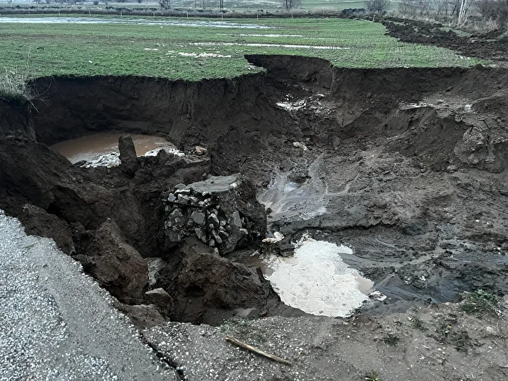 Çöken alanda su birikintisi oluştu, etrafındaki tarım arazisi zarar gördü.