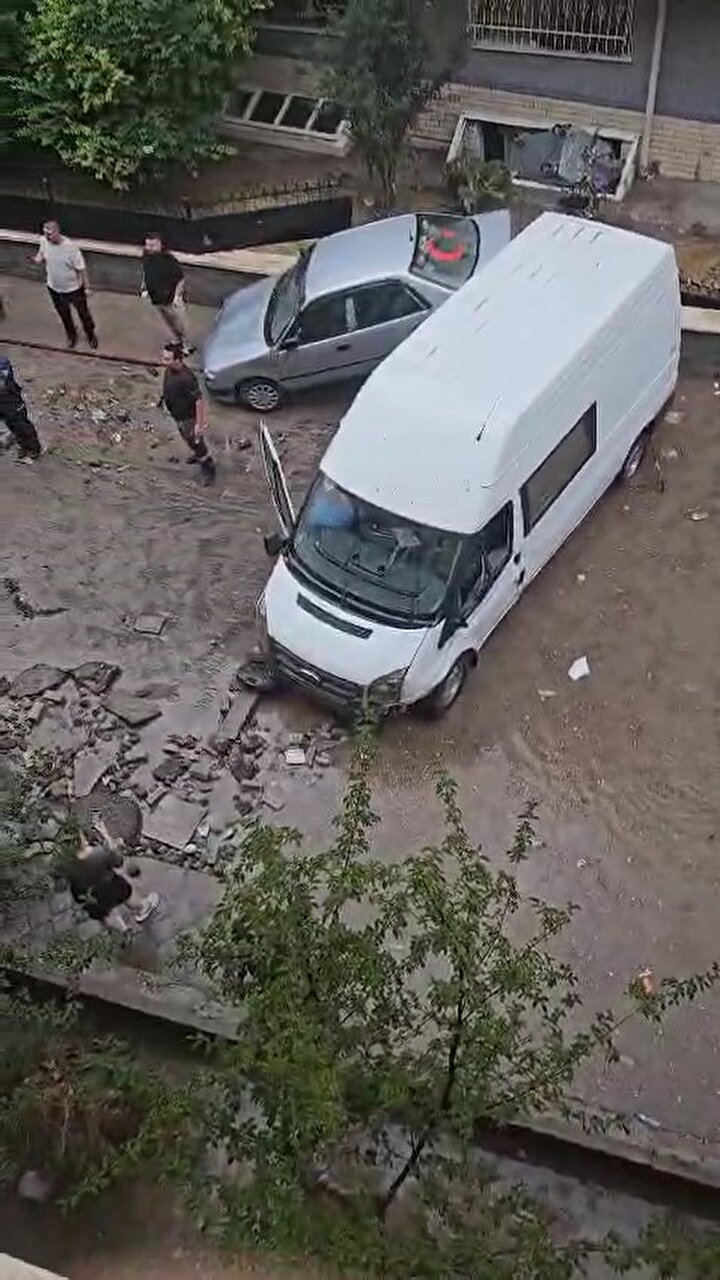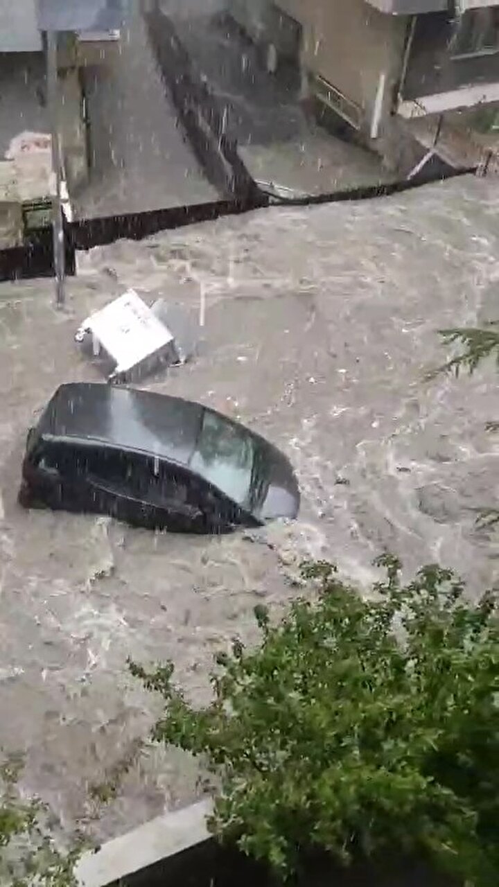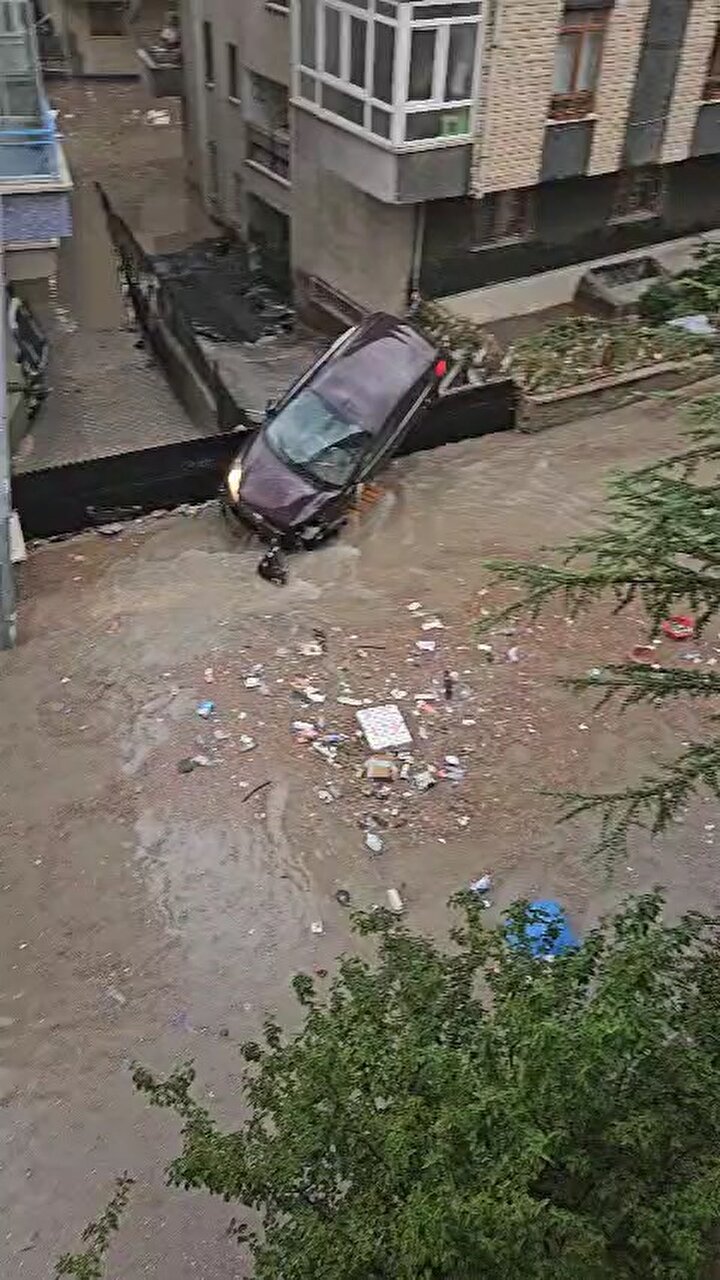 Yağış nedeniyle binaların giriş ve bodrum katlarını su altında kalırken, sokakta park halinde bulunan birçok araç sürüklenerek zarar gördü.