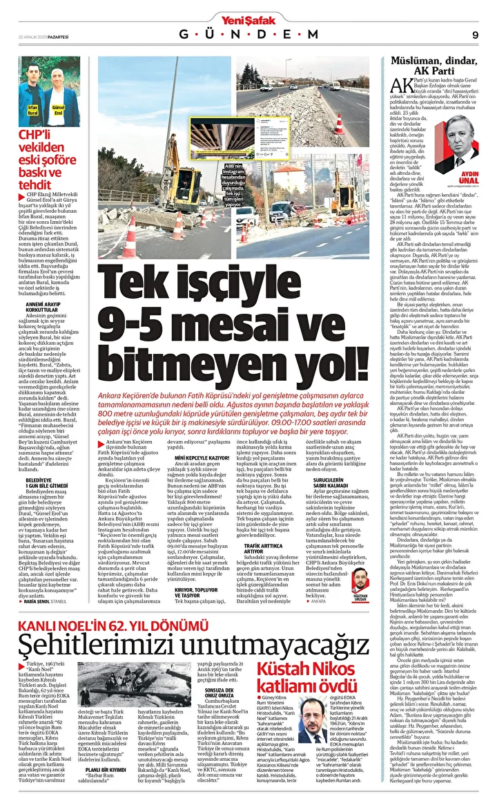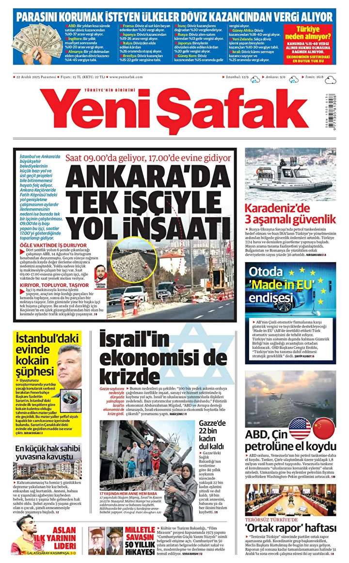 Yeni Şafak Gazetesi’nin 22 Aralık 2025 tarihli birinci sayfasında yer alan manşet ve haberler…