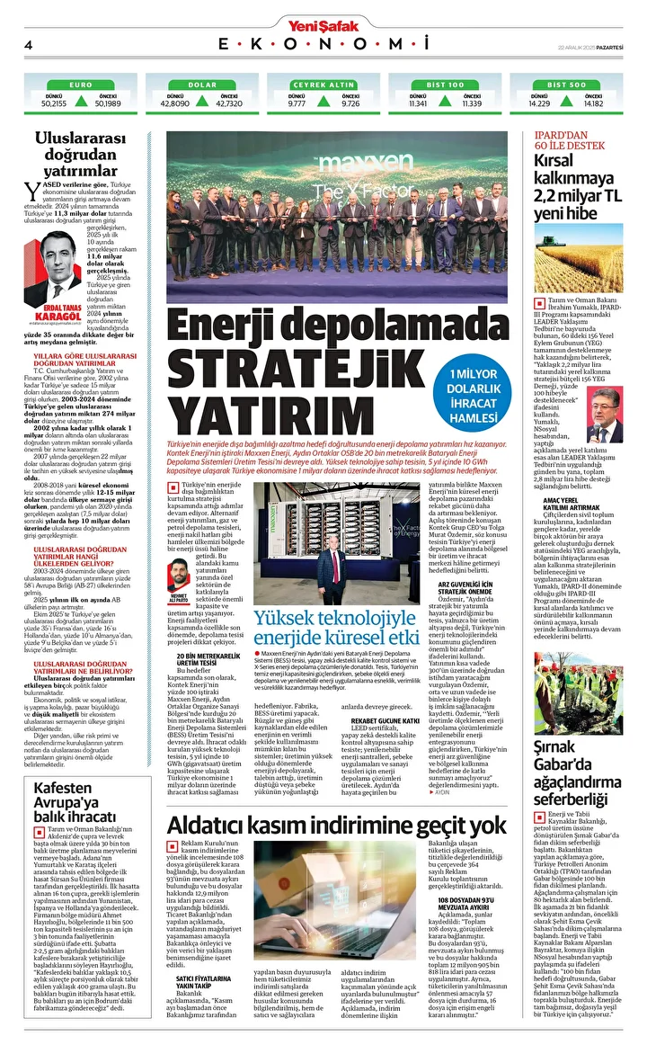 Yeni Şafak Gazetesi’nin 22 Aralık 2025 tarihli birinci sayfasında yer alan manşet ve haberler… Enerji depolamada stratejik yatırım Türkiye’nin enerjide dışa bağımlılığı azaltma hedefi doğrultusunda enerji depolama yatırımları hız kazanıyor. Kontek …