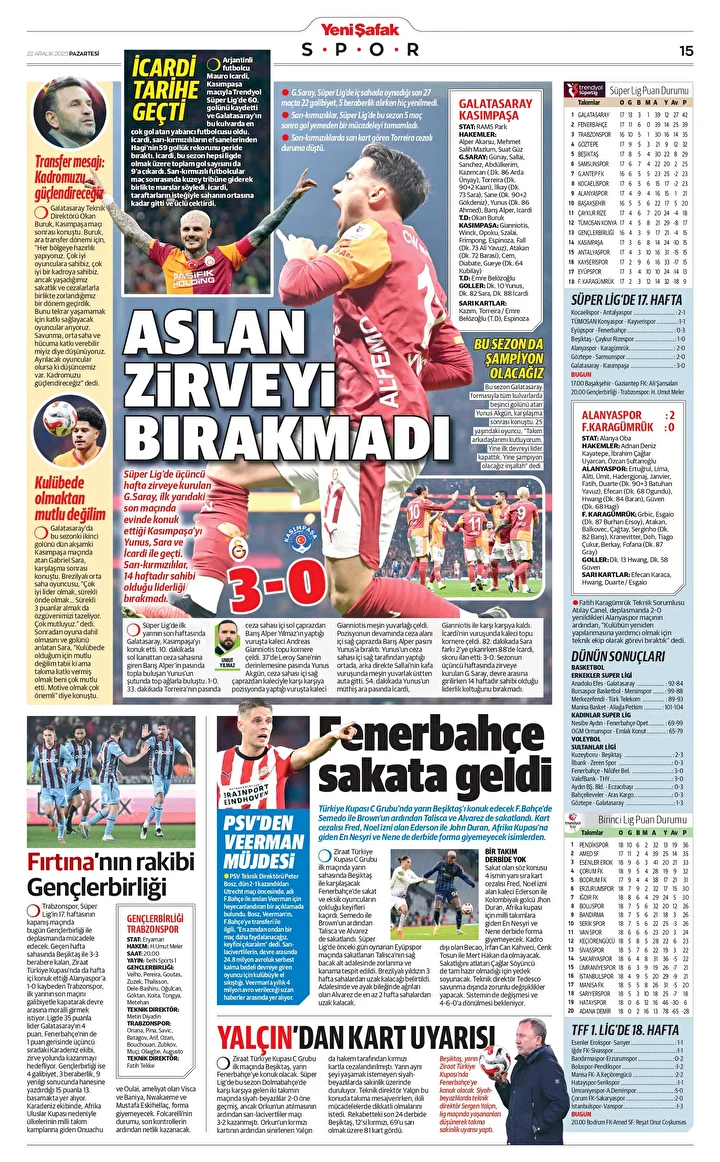 Süper Lig’de üçüncü hafta zirveye kurulan G.Saray, ilk yarıdaki son maçında evinde konuk ettiği Kasımpaşa’yı Yunus, Sara ve İcardi ile geçti. Sarı-kırmızılılar, 14 haftadır sahibi olduğu liderliği bırakmadı.