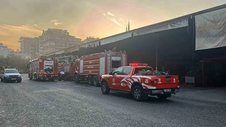 Yangın, saat 17.00 sıralarında Alanya’nın Saray Mahallesi Hacıkadırcıoğlu Caddesi üzerinde bulunan sebze ve meyve halinde meydana geldi.