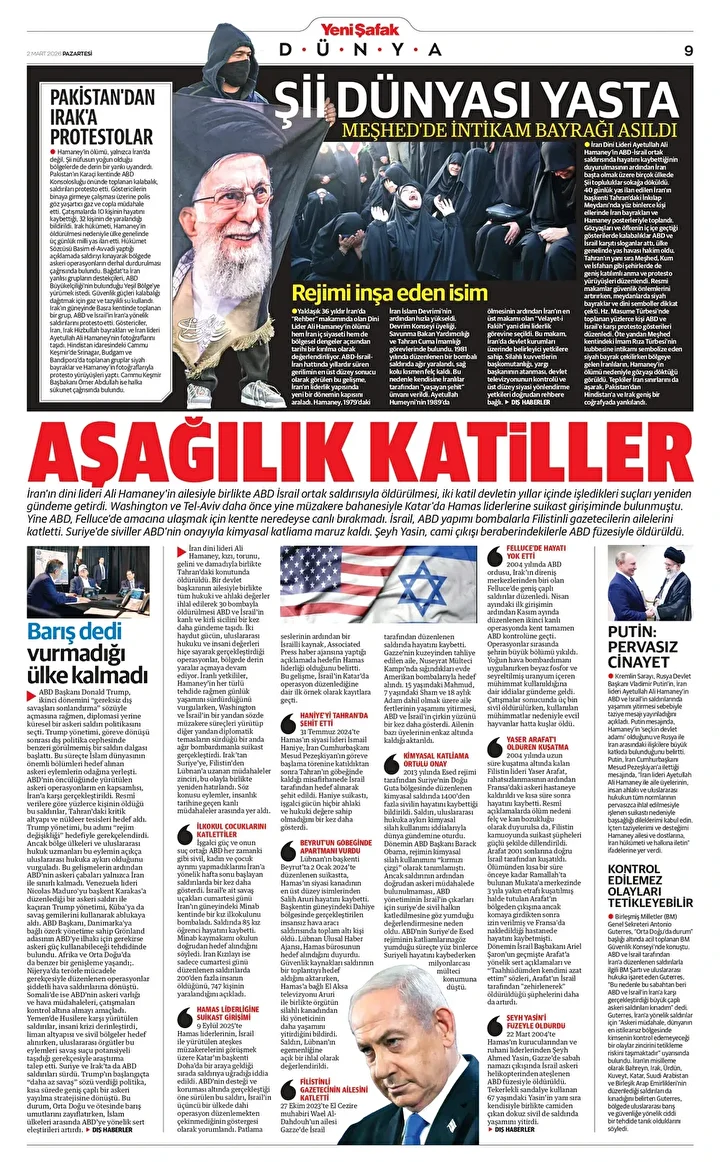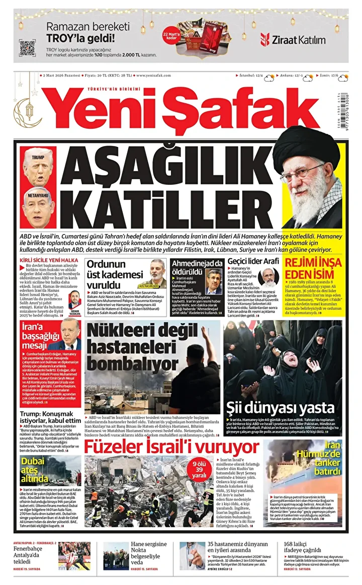 Yeni Şafak Gazetesi’nin 02 Mart 2026 tarihli birinci sayfasında yer alan manşet ve haberler…