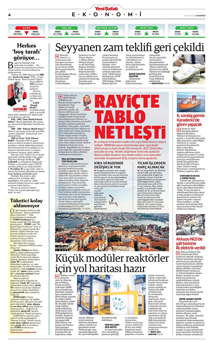Yeni Şafak Gazetesi’nin 06 Aralık 2025 tarihli birinci sayfasında yer alan manşet ve haberler…