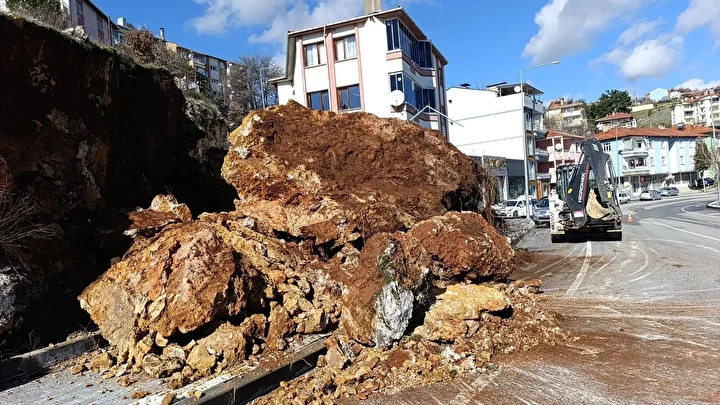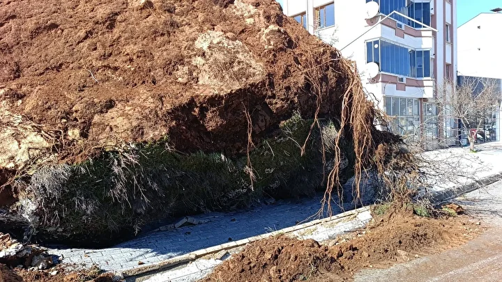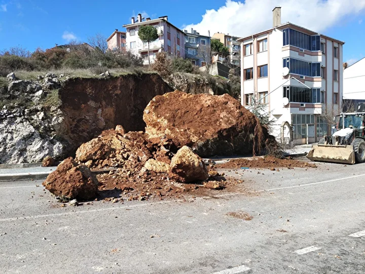 Balıkesir Caddesi’ndeki boş arsada, yoğun yağışların ardından serbest kalan büyük kaya parçası yaya kaldırımına devrildi.