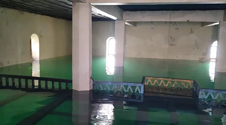 Camilerin yarısına kadar sular çekilince caminin camından içeriye girip yüzerek görüntüleri kayda almak istedim.