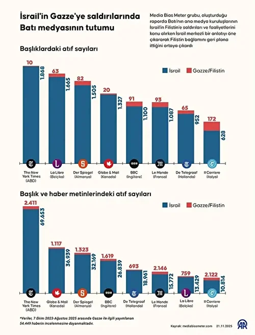Raporda, Batılı medya kuruluşlarının başlık ve metinlerinde İsrail’e, Filistin’e kıyasla ezici ölçüde daha fazla yer verdiği tespit edildi.