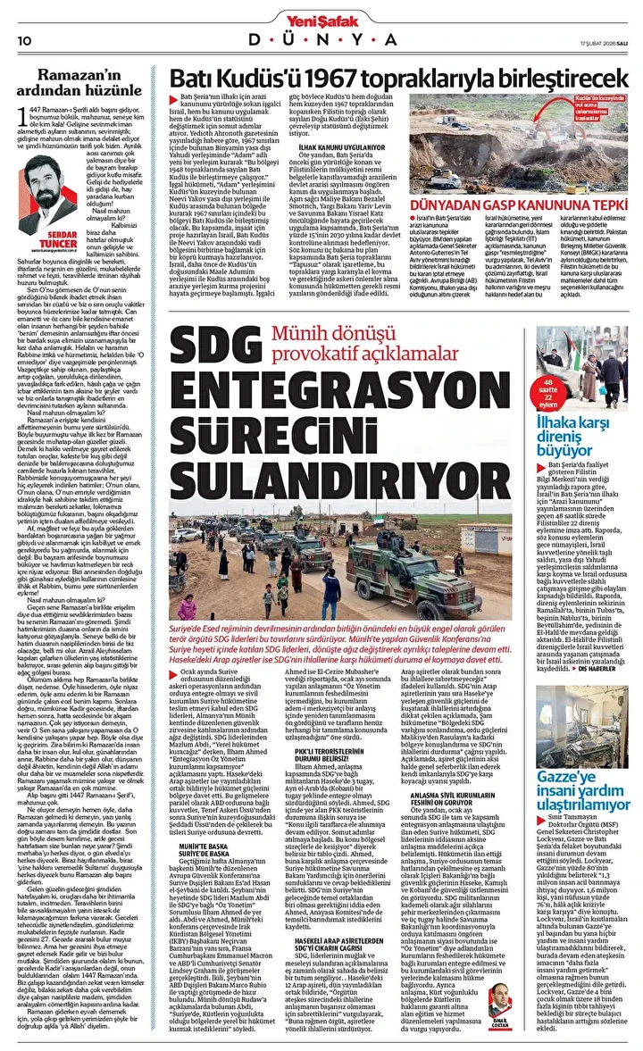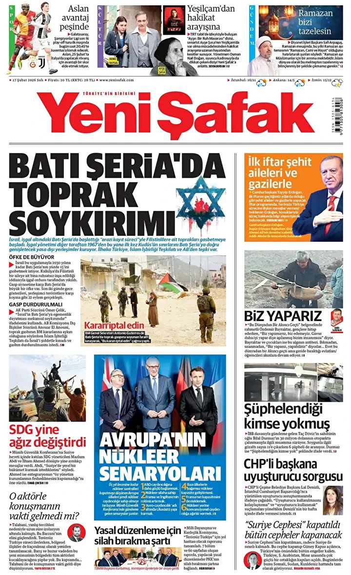 Yeni Şafak Gazetesi’nin 17 Şubat 2026 tarihli birinci sayfasında yer alan manşet ve haberler…