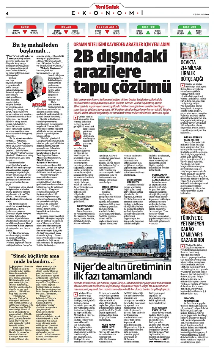 Yeni Şafak Gazetesi’nin 17 Şubat 2026 tarihli birinci sayfasında yer alan manşet ve haberler… 2b dışındaki arazilere tapu çözüm Eski orman alanları ve kullanım niteliğini yitiren Devlet Su İşleri arazilerindeki mülkiyet belirsizliği giderilecek …