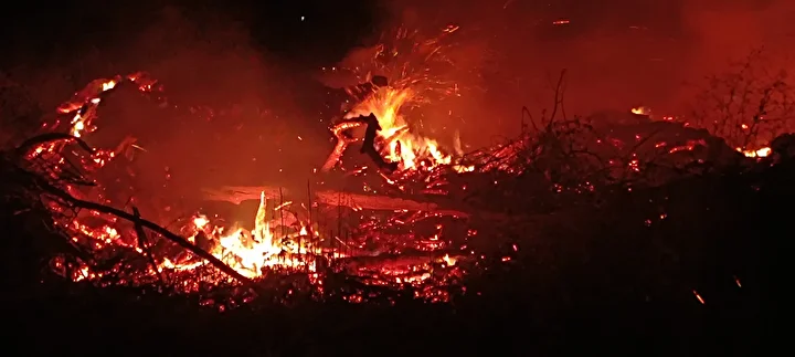 Karaçalı mevkisinde O.D’ye ait çiftlik arazisinde, çürümüş ağaç ve köklerin kontrollü olarak yakılması sırasında rüzgarın etkisiyle alevler kısa sürede yayıldı.