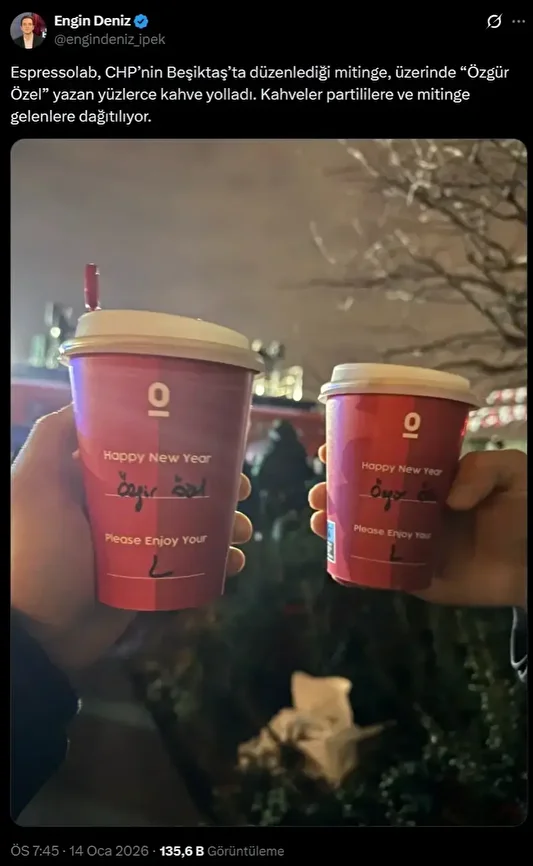 Ekrem İmamoğlu’nun yolsuzluktan tutuklanması sonrası CHP yönetimi, kahve zinciri Espressolab’i boykot listesine koymuştu. CHP lideri Özgür Özel, geçtiğimiz ekim ayında, “Karlarını fonumuza aktaracaklar” deyip Espressolab ile anlaşmaya vardıklarını söylemişti. Firma, Özel’in bugün Beşiktaş’ta düzenlediği mitinge, üzerinde ‘Özgür Özel’ yazan yüzlerce kahve yolladı.