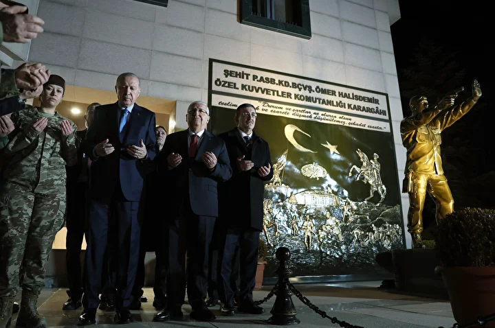 Cumhurbaşkanı Erdoğan, 15 Temmuz FETÖ darbe girişiminde hainlere geçit vermeyen kahraman şehidimiz Astsubay Kıdemli Başçavuş Ömer Halisdemir’in heykelinin ve mübarek kanının bulunduğu anıtta şehitler için dua etti.