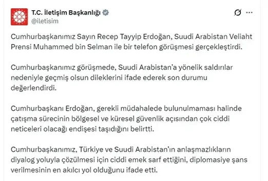 Cumhurbaşkanlığı İletişim Başkanlığının sosyal medya hesabından yapılan paylaşıma göre, Cumhurbaşkanı Erdoğan, Suudi Arabistan Veliaht Prensi Muhammed bin Selman ile gerçekleştirdiği görüşmede, Suudi Arabistan’a yönelik saldırılar nedeniyle geçmiş olsun dileklerini ifade ederek, son durumu değerlendirdi.
