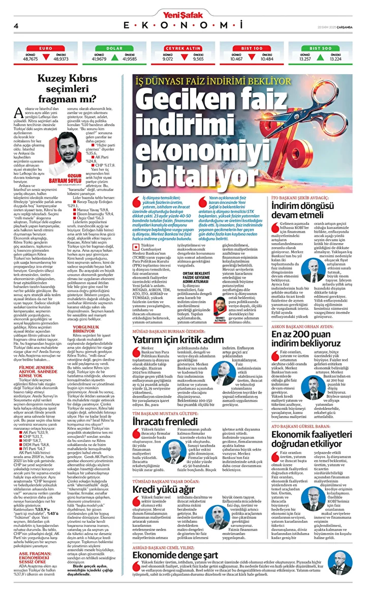 Yeni Şafak Gazetesi’nin 22 Ekim 2025 tarihli birinci sayfasında yer alan manşet ve haberler… Dayanma gücümüz kalmadı: İş dünyası faiz indirimi ve krediye erişim istiyor İş dünyası yarınki Para Politikası Kurulu (PPK) toplantısı öncesinde sanayi …