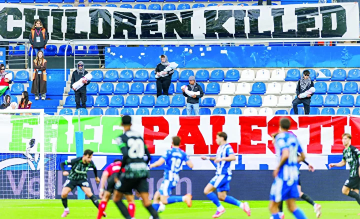 İspanya Birinci Futbol Ligi 8. hafta maçında, Deportivo Alaves ile Elche takımları Vitoria-Gasteiz şehrindeki Mendizorrotza Stadı’nda karşı karşıya geldi. Deportivo Alaves takımının taraftarları Filistin’e destek için pankart açtı. Gazze’de katledilen çocukları temsilen kırmızıya boyalı kefenlere sarılı bebek maketleri taşıdı.