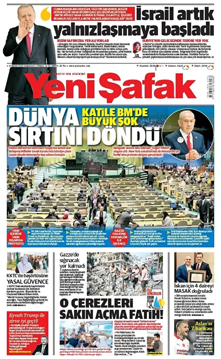 Yeni Şafak Gazetesi’nin 27 Eylül 2025 tarihli birinci sayfasında yer alan manşet ve haberler…
