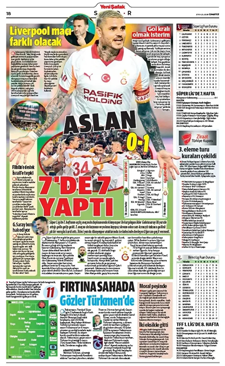 Süper Lig’de 7. haftanın açılış maçında deplasmanda Alanyaspor ile karşılaşan lider Galatasaray ilk yarıda attığı golle galip geldi. 7. maçını da kazanan ve yoluna kayıpsız devam eden sarı-kırmızılı takımın golünü şık bir vuruşla İcardi attı. İkinci yarıda Alanyaspor ataklarında ise kalesinde devleşen Uğurcan geçit vermedi.