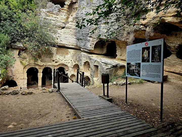 Kaya mezarlarının en geniş ve en ünlülerinden olan Beşikli Mağara’da bölümler halinde 12 mezar bulunuyor. Taş mezarlar, taş sütunlar ve kemerlerin birbirine bağladığı bölümler halinde olup, yukarıdan aşağıya yine taş merdivenlerle iniliyor.