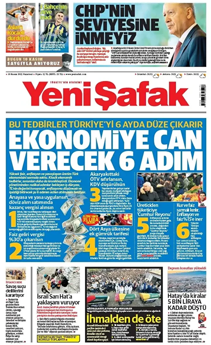 Yeni Şafak Gazetesi’nin 10 Kasım 2025 tarihli birinci sayfasında yer alan manşet ve haberler… Ekonomide reform reçetesi Yüksek enflasyon ve faiz sarmalını kırmak, ekonomide kalıcı istikrarı sağlamak için radikal adımlar atılması kaçınılmaz bir hal …