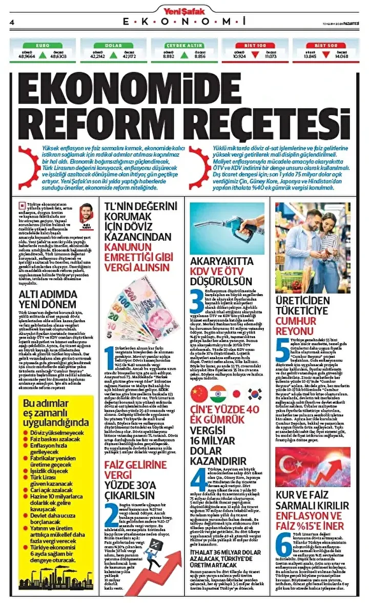 Yüksek enflasyon ve faiz sarmalını kırmak, ekonomide kalıcı istikrarı sağlamak için radikal adımlar atılması kaçınılmaz bir hal aldı. Ekonomik bağımsızlığımızı güçlendirecek, Türk Lirasının değerini koruyacak, enflasyonu düşürecek ve işsizliği azaltacak dönüşüme olan ihtiyaç gün geçtikçe artıyor. Yeni Şafak’ın son iki yılda yaptığı haberlerde sunduğu öneriler, ekonomide reform niteliğinde.