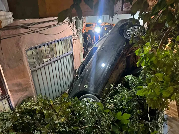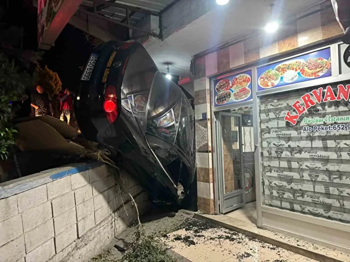 Bahçe duvarı ile lokanta duvarı arasında sıkışan otomobil, olay yerine çağrılan vinç yardımıyla çıkartılırken kazayla ilgili başlatılan soruşturma devam ediyor.