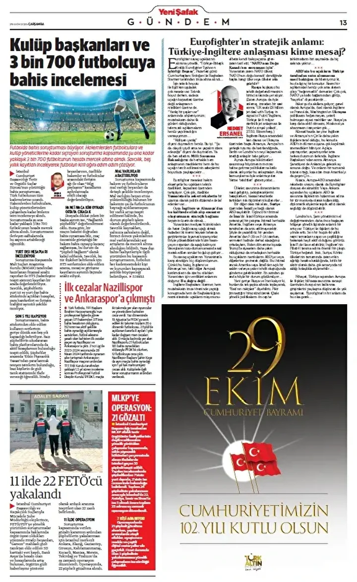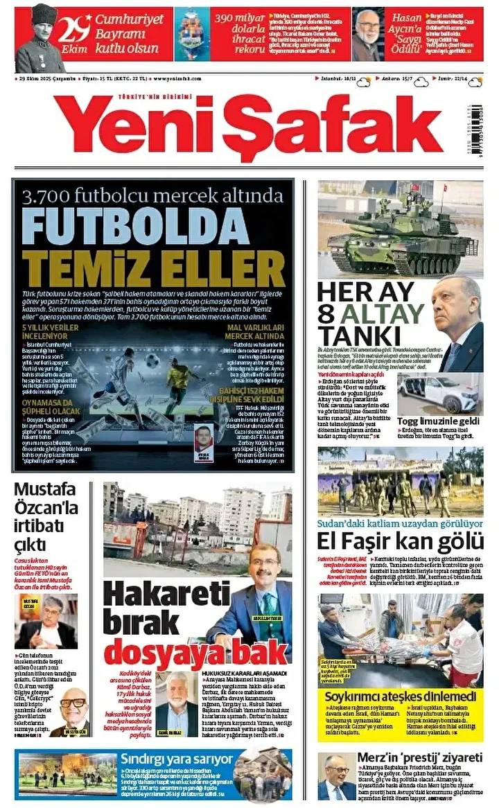 Yeni Şafak Gazetesi’nin 29 Ekim 2025 tarihli birinci sayfasında yer alan manşet ve haberler…