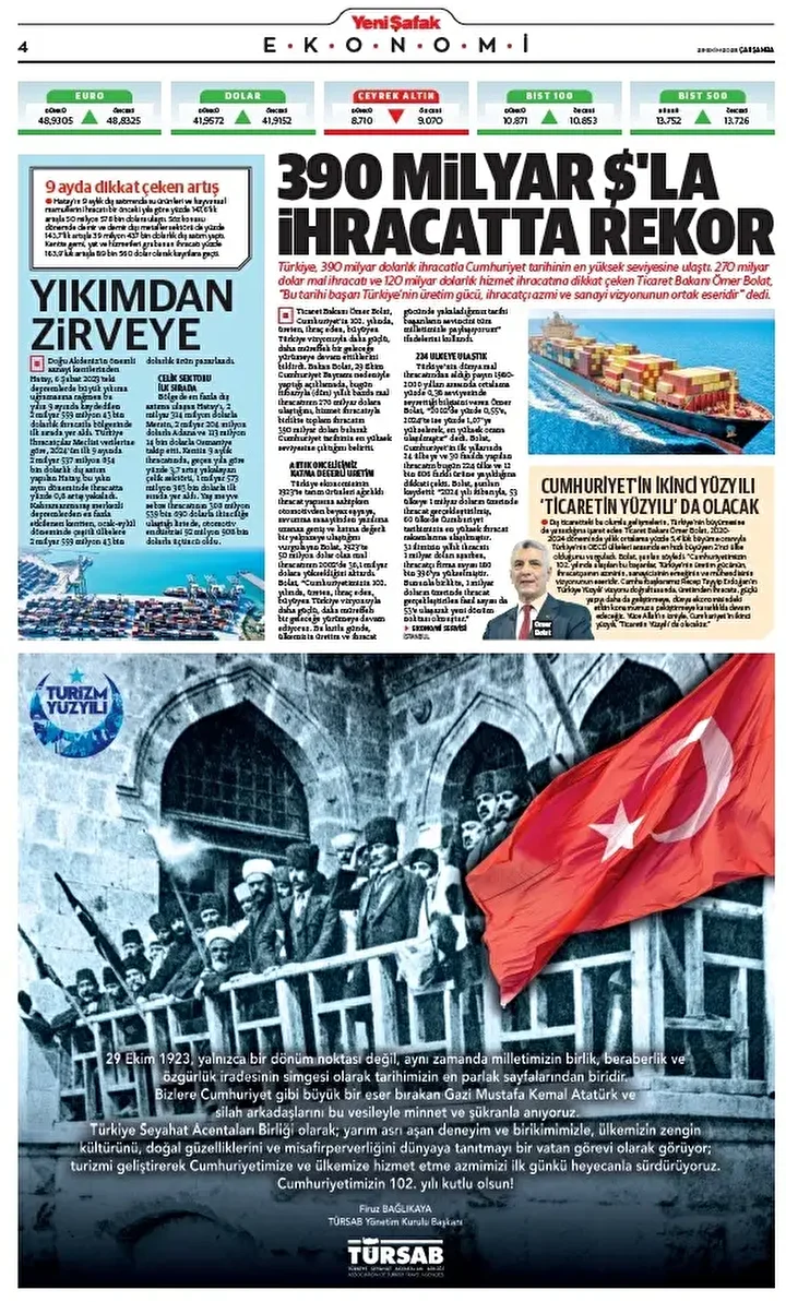 Yeni Şafak Gazetesi’nin 29 Ekim 2025 tarihli birinci sayfasında yer alan manşet ve haberler… 390 milyar dolarla ihracatta rekor Türkiye, 390 milyar dolarlık ihracatla Cumhuriyet tarihinin en yüksek seviyesine ulaştı. 270 milyar dolar mal ihracatı …