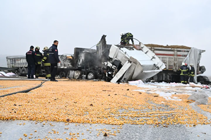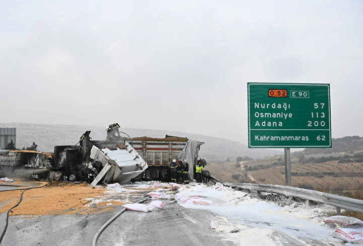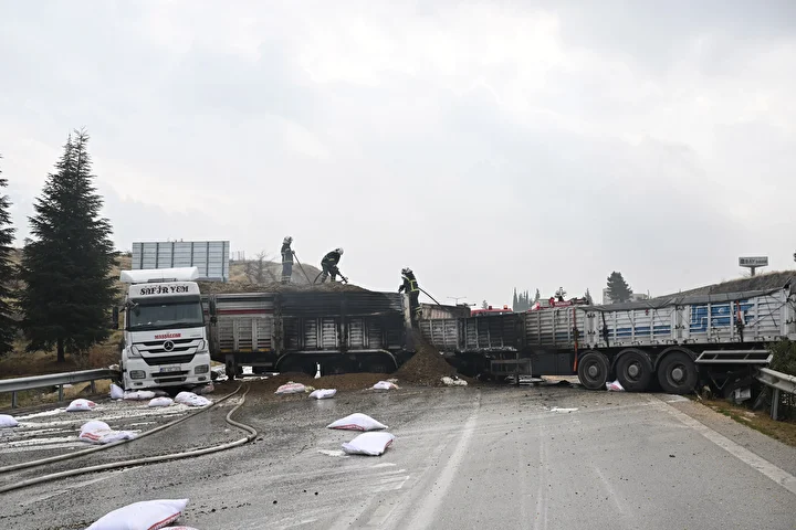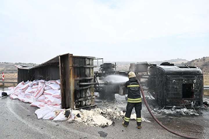Gaziantep’te 3 tırın çarpıştığı zincirleme trafik kazasının ardından araçlarda çıkan yangın söndürüldü.