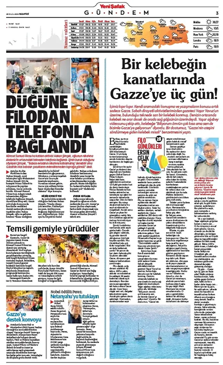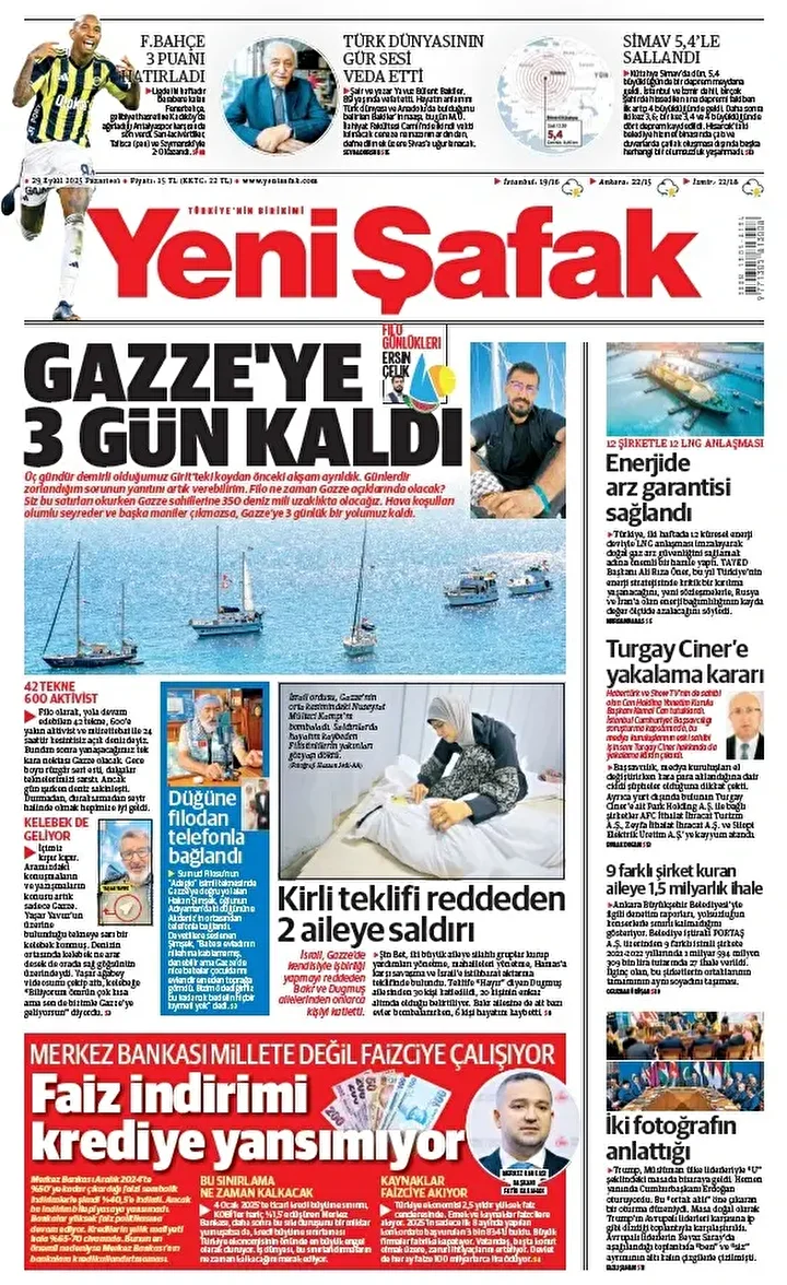 Yeni Şafak Gazetesi’nin 29 Eylül 2025 tarihli birinci sayfasında yer alan manşet ve haberler… Bir kelebeğin kanatlarında Gazze’ye üç gün! İçimiz kıpır kıpır. Kendi aramızdaki konuşma ve yazışmaların konusu artık sadece Gazze. Sabah dirayetli …