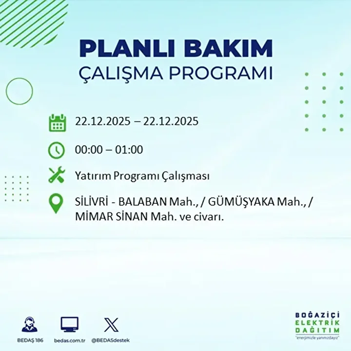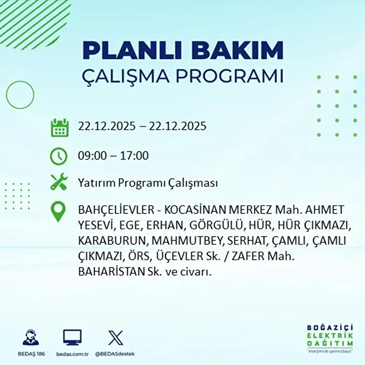 İstanbul Avrupa Yakası, haftaya büyük bir elektrik kesintisi dalgasıyla başlıyor. Boğaziçi Elektrik Dağıtım A.Ş. (BEDAŞ), 22 Aralık 2025 Pazartesi günü planlı bakım ve yatırım çalışmaları kapsamında 19 ilçede elektrik kesintisine gidileceğini duyurdu …