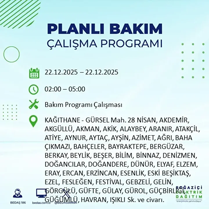 İstanbul Avrupa Yakası, haftaya büyük bir elektrik kesintisi dalgasıyla başlıyor. Boğaziçi Elektrik Dağıtım A.Ş. (BEDAŞ), 22 Aralık 2025 Pazartesi günü planlı bakım ve yatırım çalışmaları kapsamında 19 ilçede elektrik kesintisine gidileceğini duyurdu. Gece saatlerinde başlayıp sabahın ilk ışıklarına kadar, bazı bölgelerde ise içerisinde çeşitli saatlerde yaşanacak kesintiler 8 saati bulacak. Bağcılar, Bahçelievler ve Eyüpsultan başta olmak üzere kesintiden etkilenecek mahallelerin tam listesi belli oldu.