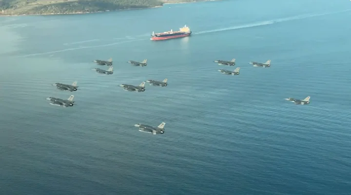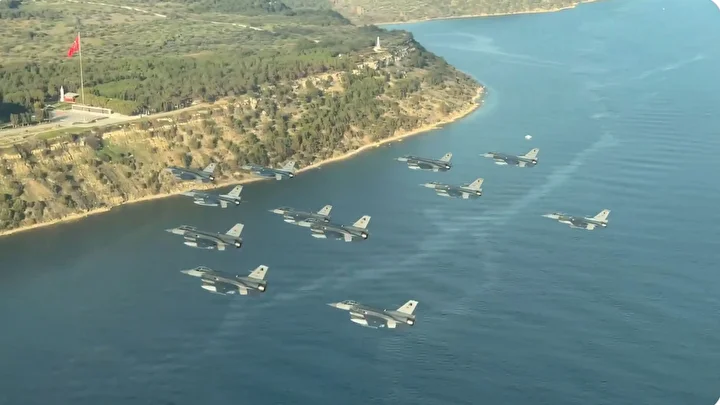 “6’ncı Ana Jet Üs Komutanlığımıza bağlı 161’inci ve 162’nci Jet Filo Komutanlıklarımızın katılımıyla elektronik harp destekli ’çok uçaklı taarruz’ eğitimi başarıyla icra edildi. Görevin tamamlanmasının ardından pilotlarımız; her karış toprağı kahramanlık kokan bu mukaddes diyarda, ‘Çanakkale geçilmez’ sözünü tarihe altın harflerle yazdıran ecdadımızı saygıyla selamladı. Bu anlamlı selamlamanın ardından uçaklarımız, Bandırma’da konuşlu 6’ncı Ana Jet Üs Komutanlığımıza emniyetle iniş yaptı.”