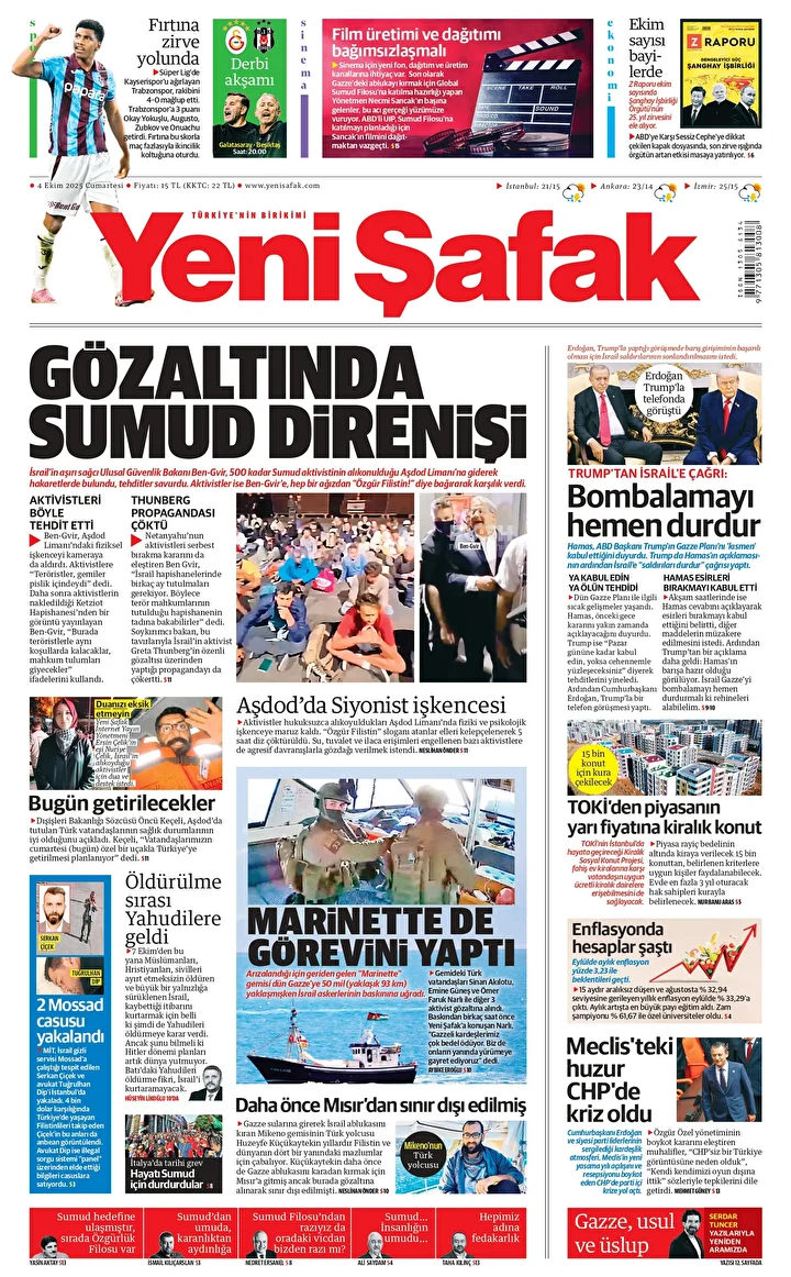 Yeni Şafak Gazetesi’nin 04 Ekim 2025 tarihli birinci sayfasında yer alan manşet ve haberler…