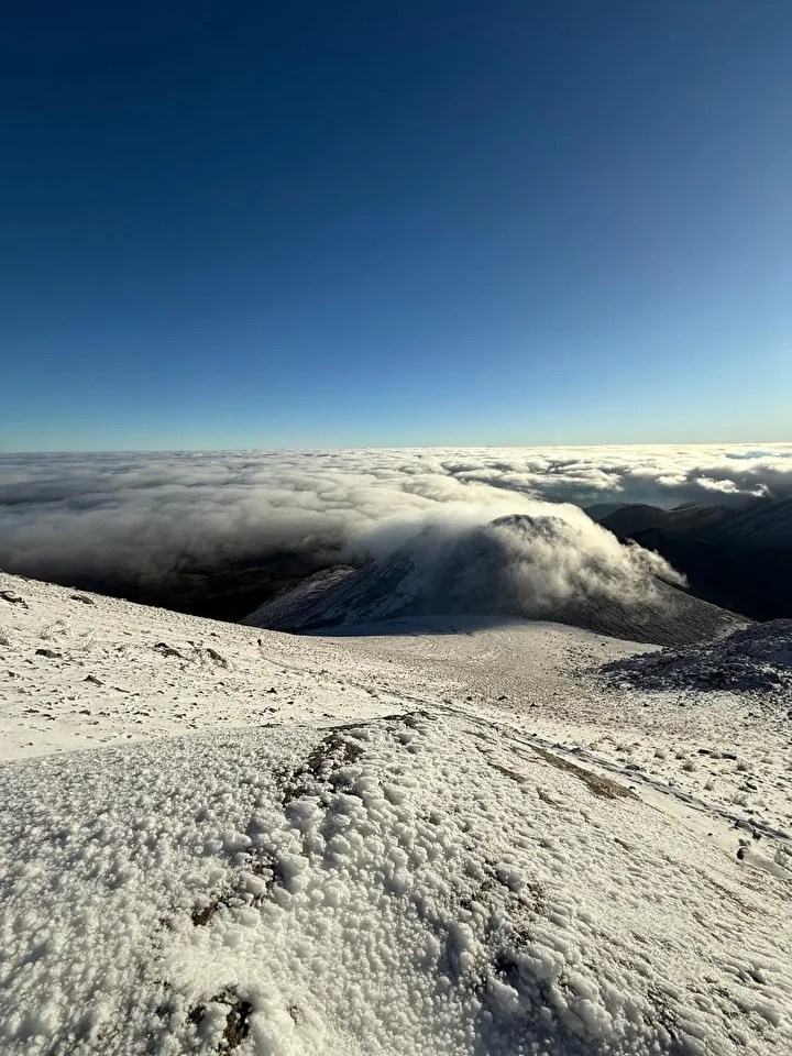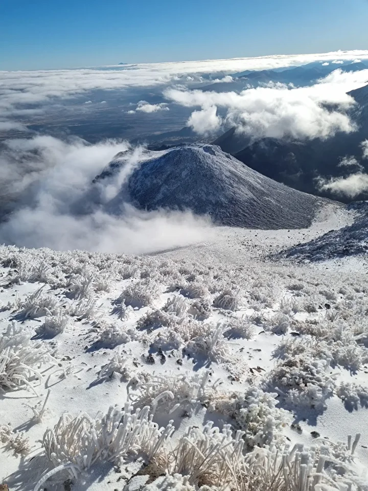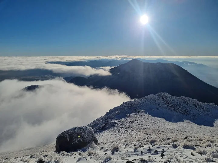 Zirvede güzel görüntülere tanıklık ettiklerini belirten Ömer Yiğit, “Zirvede yılın ilk karını görüntüledik. Yaklaşık 10 santim kar var. Güneş, bulutlarla ve muhteşem sisle birleşince tüm yorgunluğumuzu aldı..