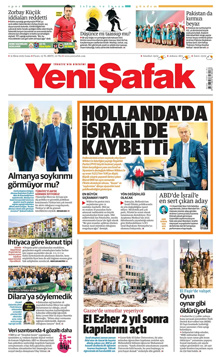 Yeni Şafak Gazetesi’nin 31 Ekim 2025 tarihli birinci sayfasında yer alan manşet ve haberler…