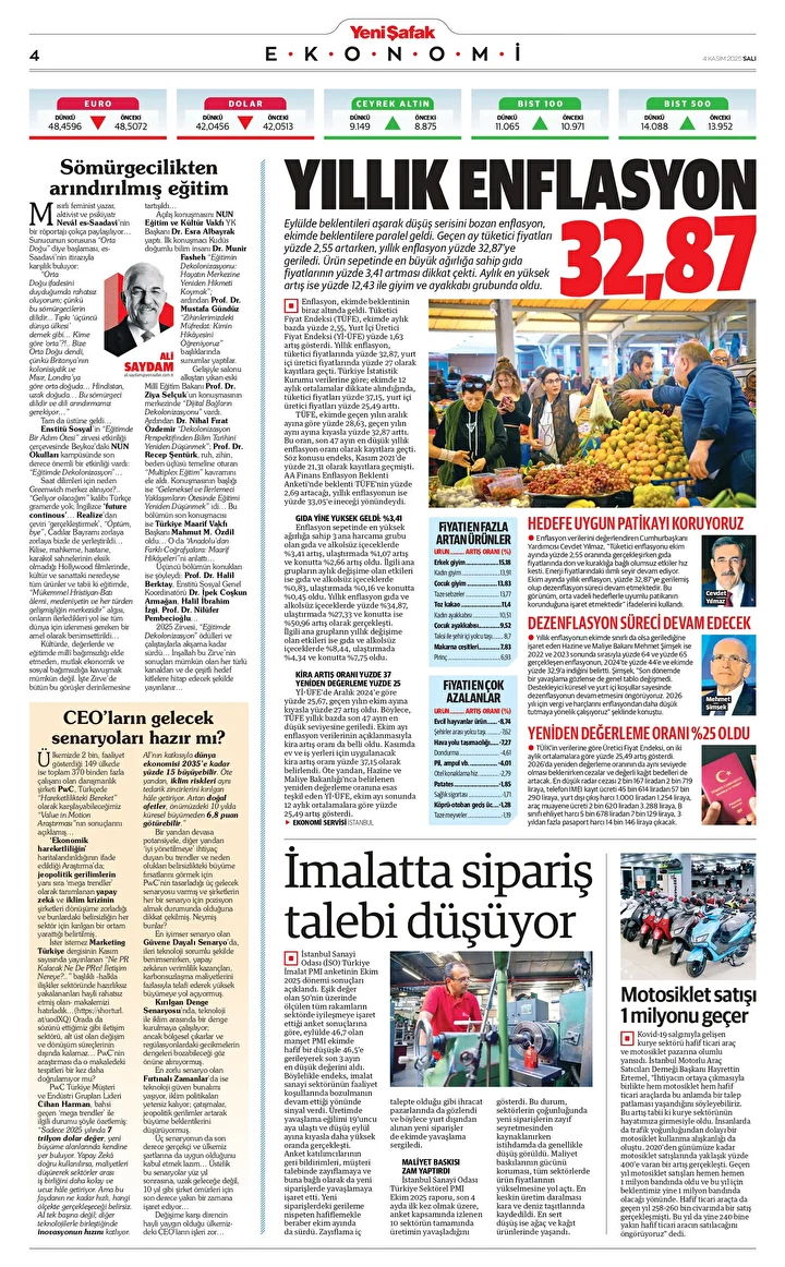 Yeni Şafak Gazetesi’nin 04 Kasım 2025 tarihli birinci sayfasında yer alan manşet ve haberler… Yıllık enflasyon yüzde 32.87 Eylülde beklentileri aşarak düşüş serisini bozan enflasyon, ekimde beklentilere paralel geldi. Geçen ay tüketici fiyatları …