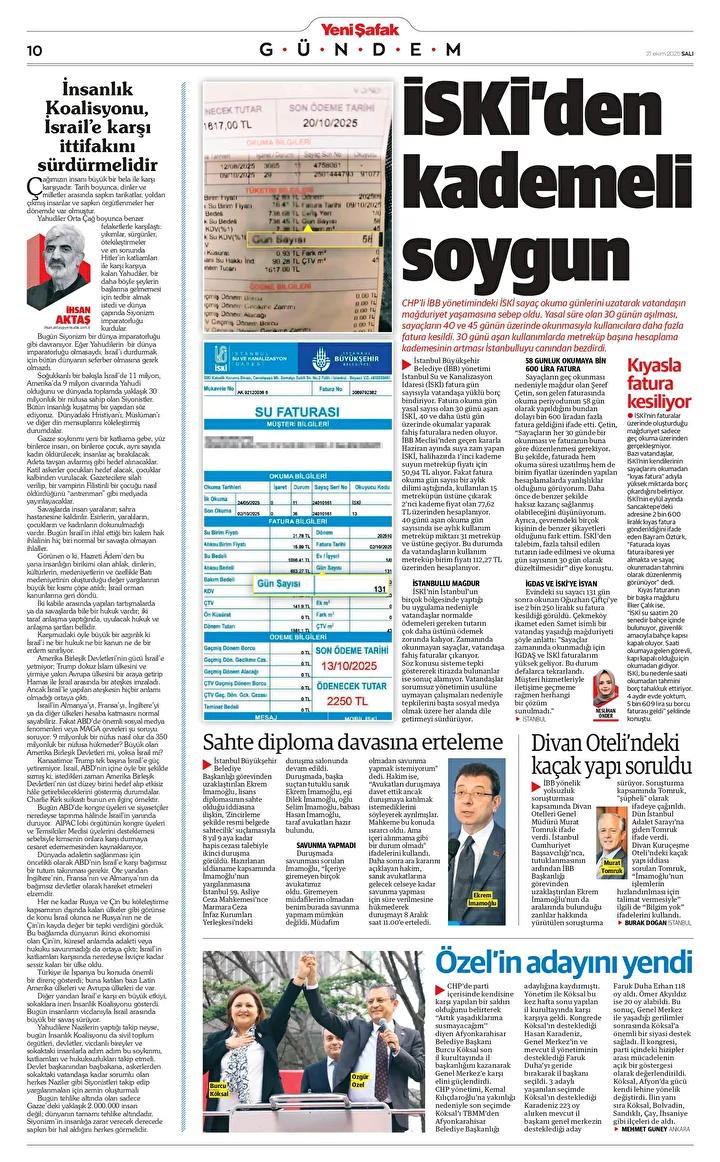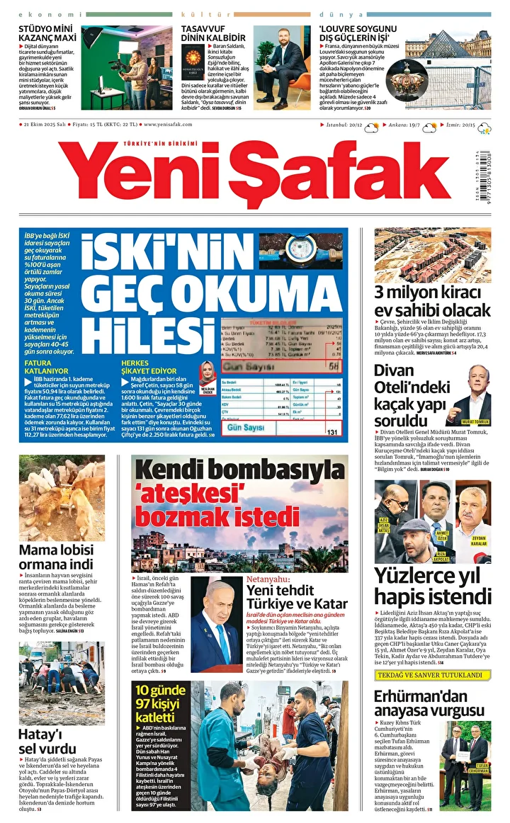Yeni Şafak Gazetesi’nin 21 Ekim 2025 tarihli birinci sayfasında yer alan manşet ve haberler…