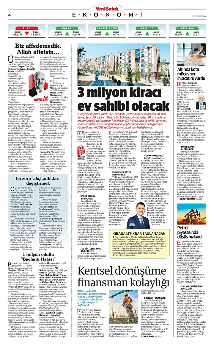 Yeni Şafak Gazetesi’nin 21 Ekim 2025 tarihli birinci sayfasında yer alan manşet ve haberler… 3 milyon kiracı ev sahibi olacak Türkiye’de nüfusun yüzde 56’sı ev sahibi, yüzde 44’ü ise kiracı konumunda. Çevre, Şehircilik ve İklim Değişikliği …