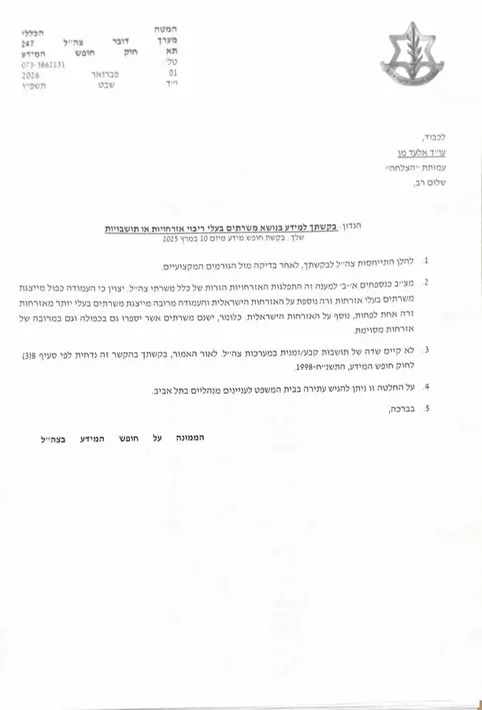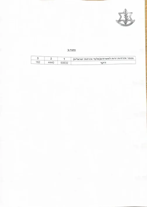 c) İsrail ordu sistemlerinde kalıcı/geçici ikametgah alanı bulunmadığından, talebinizin bu kısmı Bilgi Edinme Özgürlüğü Yasası’nın 8(3) maddesi uyarınca reddedilmiştir.