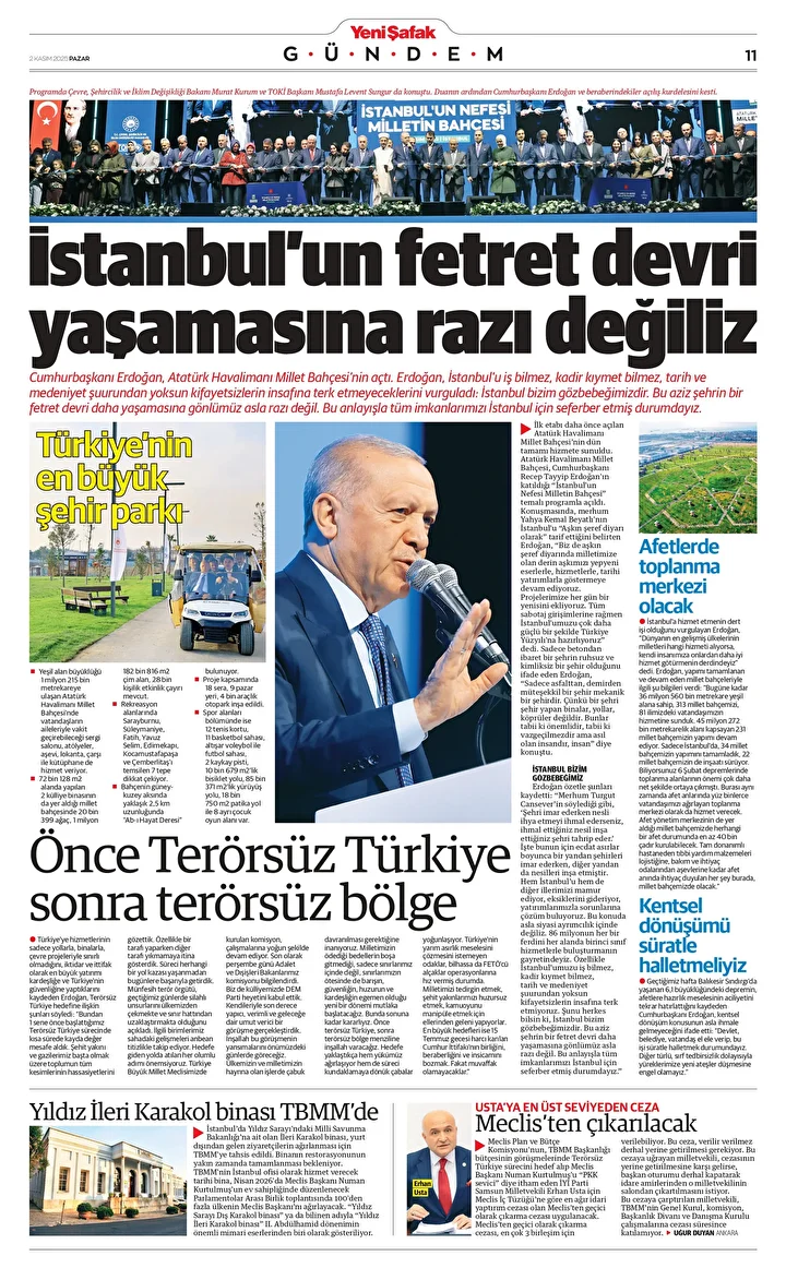 Yeni Şafak Gazetesi’nin 02 Kasım 2025 tarihli birinci sayfasında yer alan manşet ve haberler…