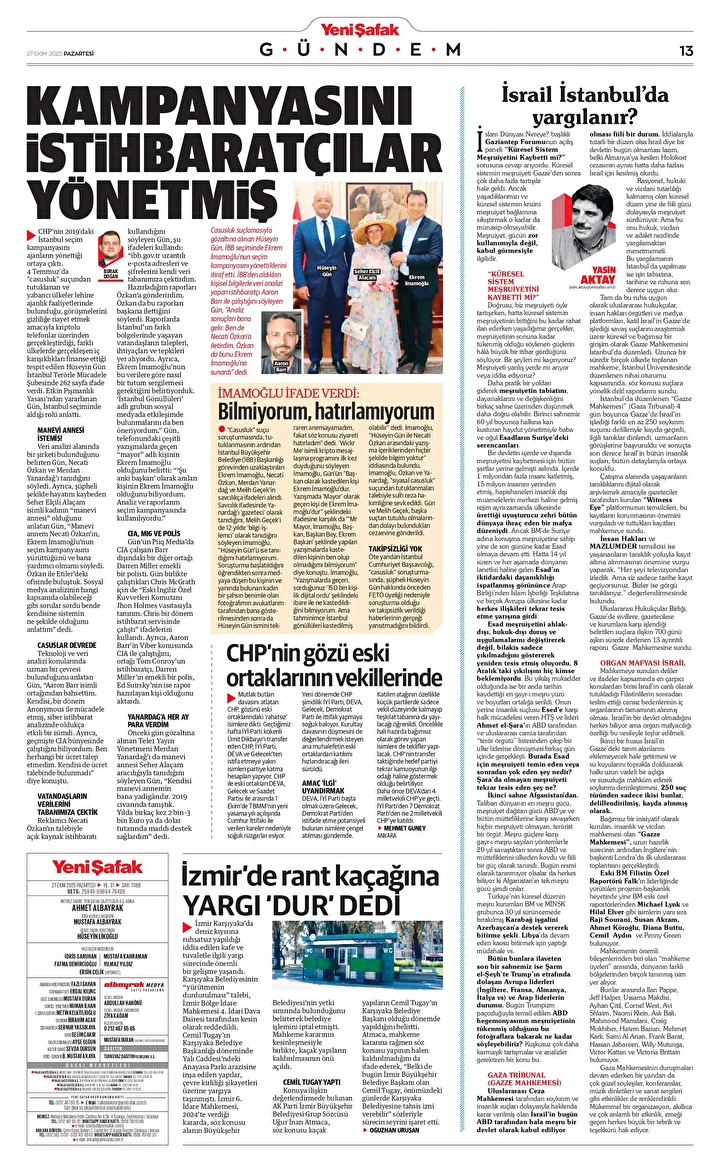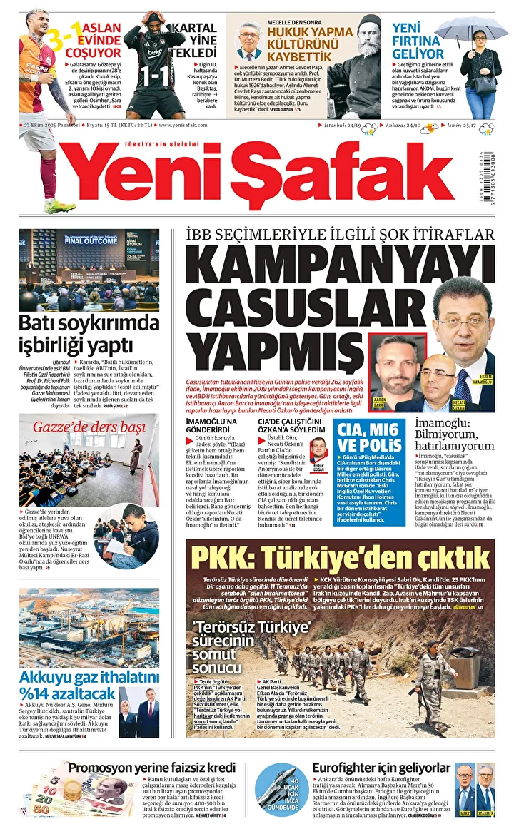 Yeni Şafak Gazetesi’nin 27 Ekim 2025 tarihli birinci sayfasında yer alan manşet ve haberler…