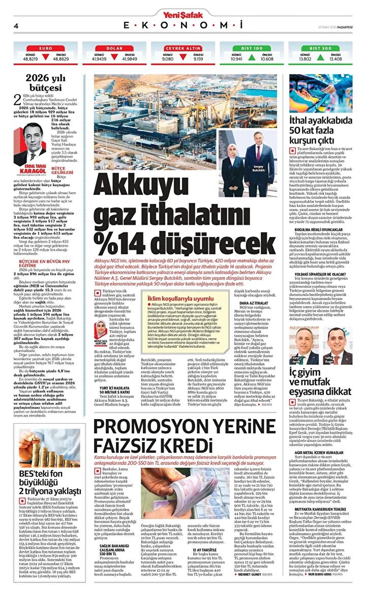Yeni Şafak Gazetesi’nin 27 Ekim 2025 tarihli birinci sayfasında yer alan manşet ve haberler… Akkuyu gaz ithalatını yüzde 14 düşürecek Akkuyu NGS’nin, işletmede kalacağı 60 yıl boyunca Türkiye, 420 milyar metreküp daha az doğal gaz ithal edecek …