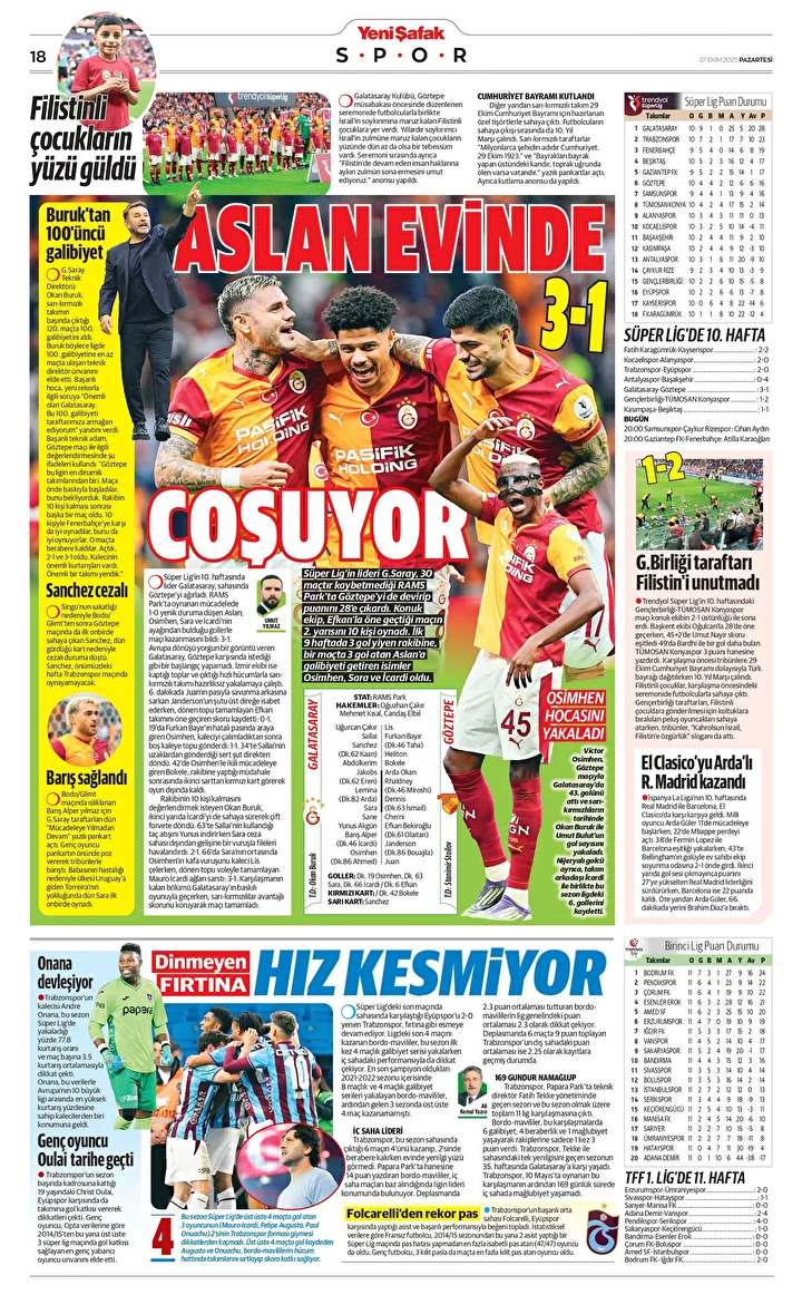 Süper Lig’in lideri Galatasaray 30 maçtır kaybetmediği RAMS Park’ta Göztepe’yi de devirip puanını 28’e çıkardı. Konuk ekip, Efkan’la öne geçtiği maçın 2. yarısını 10 kişi oynadı. İlk 9 haftada 3 gol yiyen rakibine, bir maçta 3 gol atan Aslan’a galibiyeti getiren isimler Osimhen, Sara ve İcardi oldu.