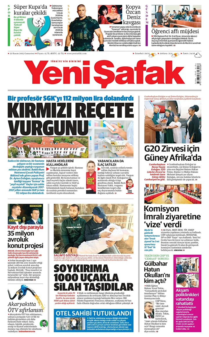 Yeni Şafak Gazetesi’nin 22 Kasım 2025 tarihli birinci sayfasında yer alan manşet ve haberler…